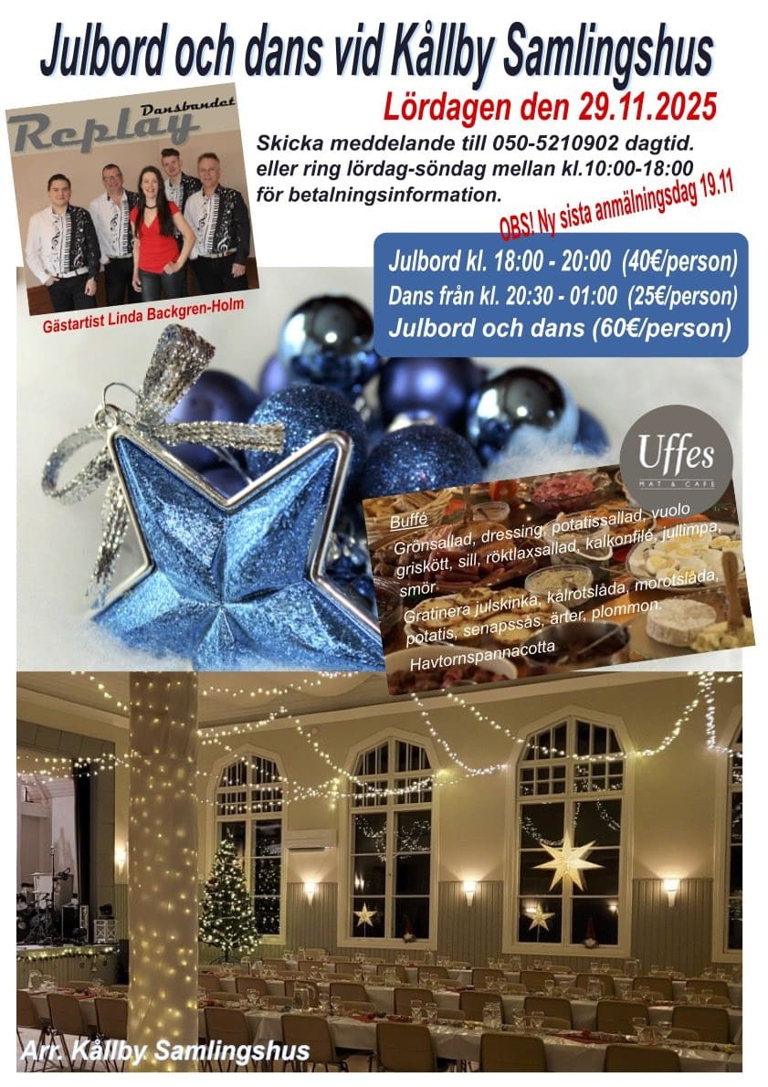 Lördag 29.11 Kållby – Samlingshuset – Julbord & Dans – Anmäl dig här – Replay & Linda Backgren Holm kl 18 – 01.00